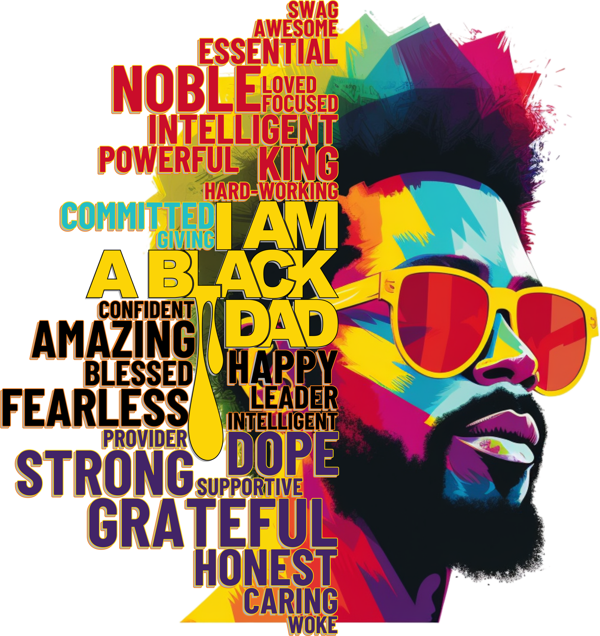 "I AM A BLACK DAD" DTF Transfer features a colorful design celebrating and showcasing positive adjectives, perfect for honoring the role of black fathers. This transfer is a unique way to express pride, appreciation and love. Add a vibrant touch to your apparel with this eye-catching design.